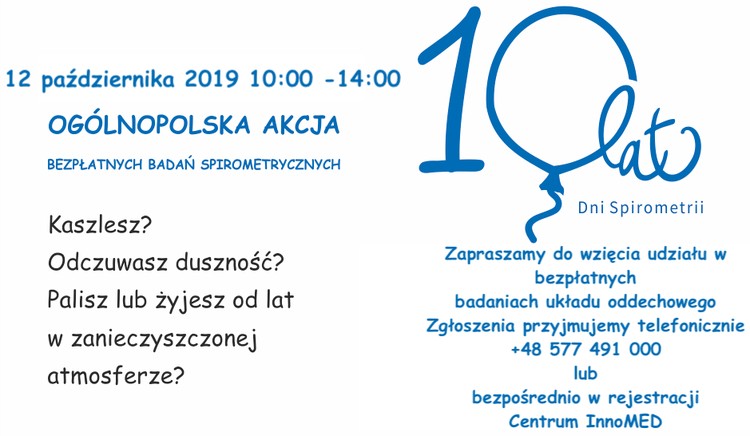 W dniu 12 października 2019 odbędą się w naszym Centrum Medycznym BEZPŁATNE badania spirometryczne.