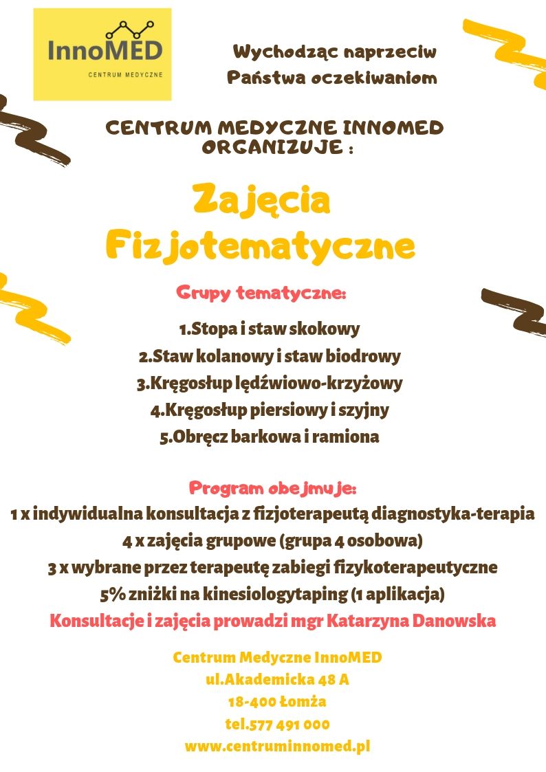 Naprzeciw oczekiwaniom naszych Pacjentów stworzyliśmy specjalne zajęcia fizjotematyczne. Pacjenci z podobnymi dolegliwościami będą mogli w małej grupie (4 osób) poznać ćwiczenia ukierunkowane na konkretne problemy.